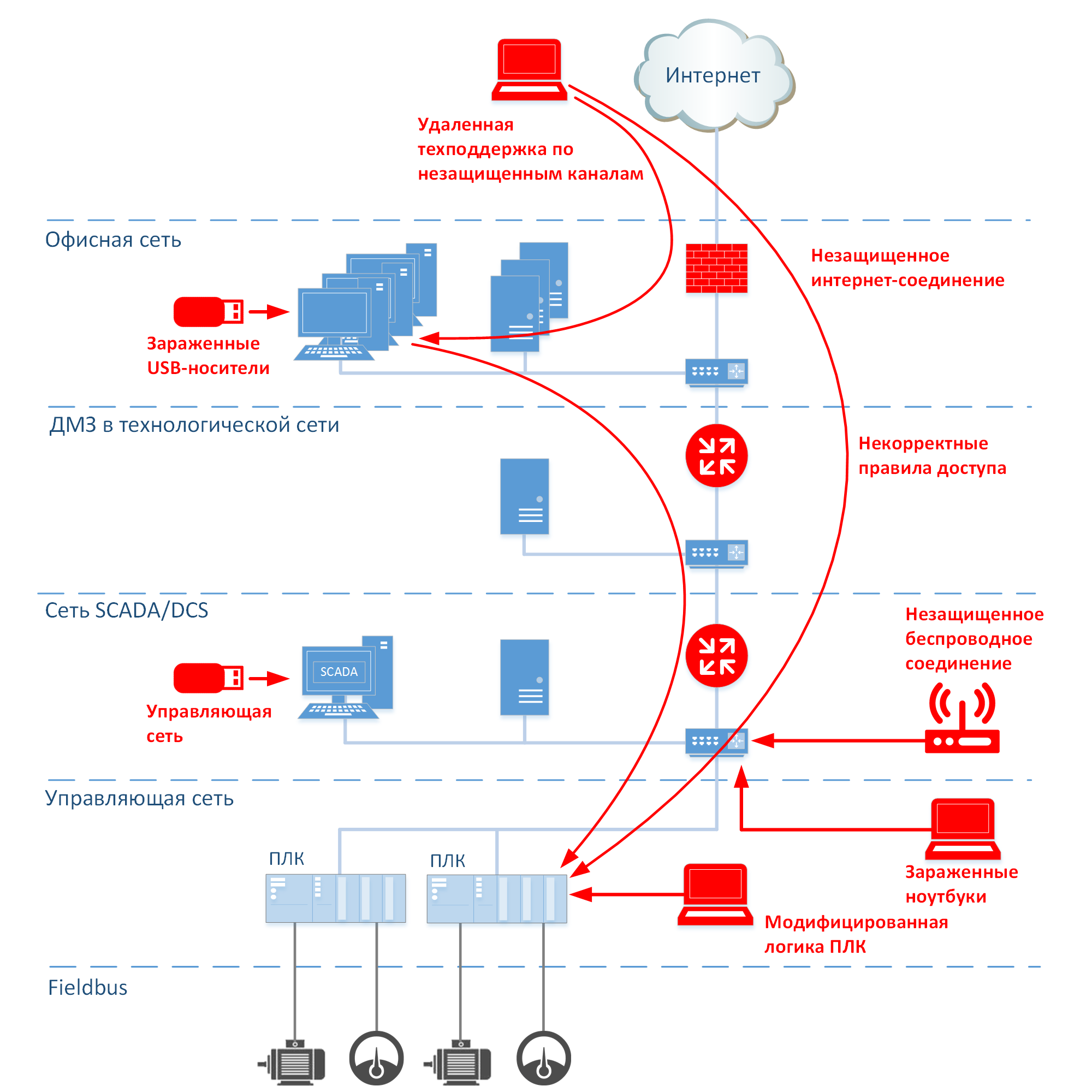 Подключающийся извне технологической сети пользователь (подрядчик, разработчик, администратор) часто имеет высокие права доступа на уровне локальной системы или на уровне всей сети. Если разделение на уровни организовано в виде плоской сети или нескольких виртуальных подсетей (VLAN) с общим ядром сети и без достаточных разграничений доступа, то такой пользователь может случайно или намеренно заразить компьютеры в технологической сети.