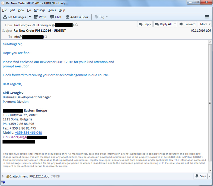 Во всех исследованных нами случаях фишинговые письма отправлялись от имени различных компаний-поставщиков, заказчиков, коммерческих организаций и служб доставки с предложением посмотреть обновленные списки цен на продукцию, требованием срочно проверить информацию по счету, уточнить расценки на продукцию, переслать якобы поврежденный файл или получить груз по накладной.