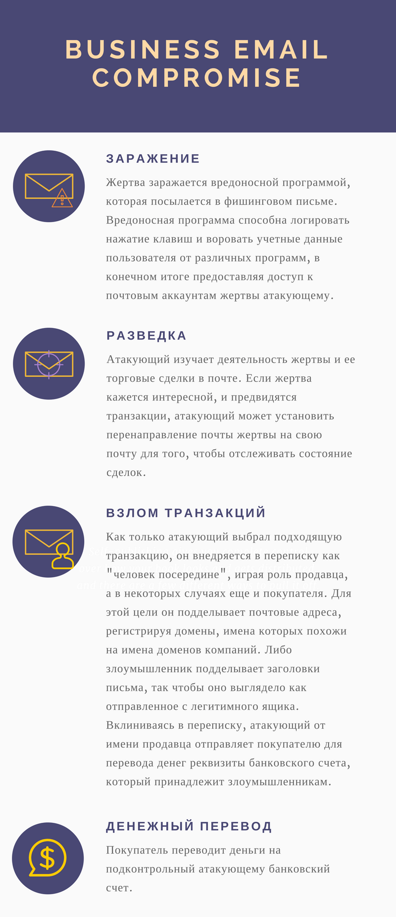 Атаки типа Business Email Compromise хорошо известны. На сегодняшний день описано несколько сценариев таких атак. Некоторые из них и были применены в исследуемых нами целевых атаках.