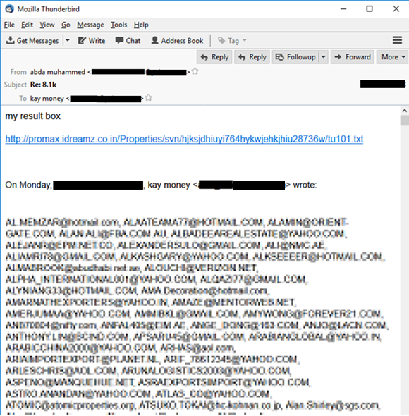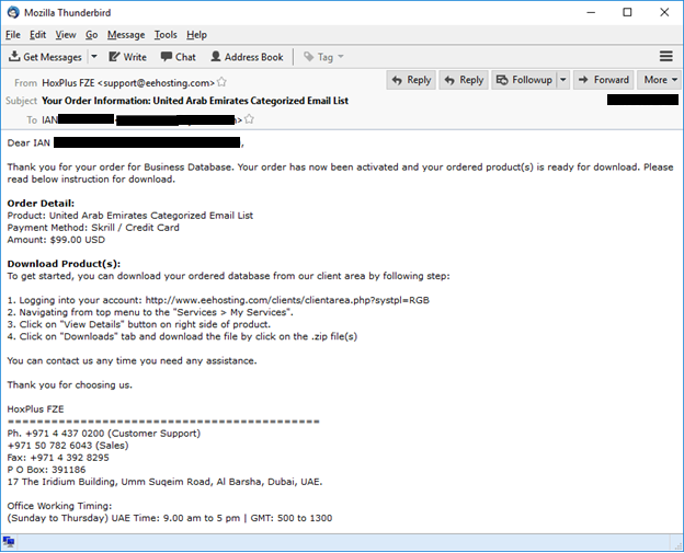 В 2015 году очевидно уже проводились целевые атаки по географическому принципу. Ниже — письмо, подтверждающее покупку нигерийский фишером базы адресов компаний в ОАЭ. Эта покупка обошлась злоумышленнику в 99 долларов.