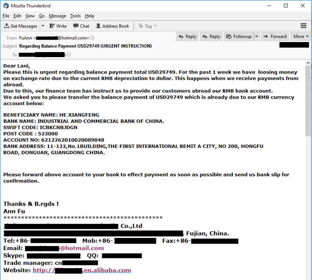 Письмо с поддельными заголовками и измененными банковскими данными, якобы отправленное с легитимного ящика продавца на Alibaba