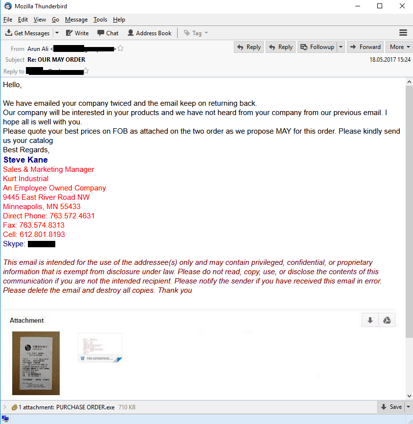 Фишеры явно постарались, чтобы их подделки выглядели весьма убедительно для сотрудников атакованных предприятий. Среди названий вложений нам встречались, например, «Energy & Industrial Solutions W.L.L_pdf», «Woodeck Specifications best Prices Quote.uue» и «Saudi Aramco Quotation Request for October 2016».