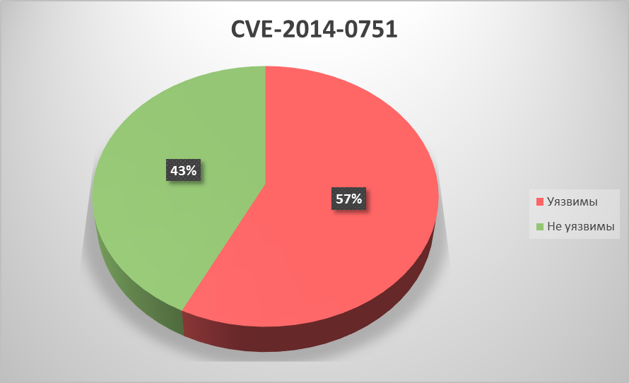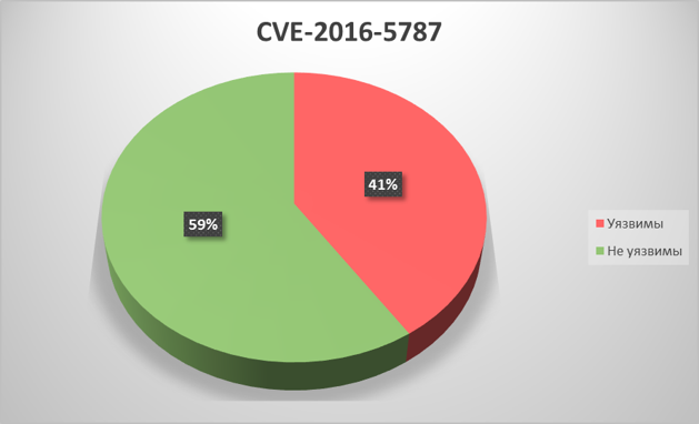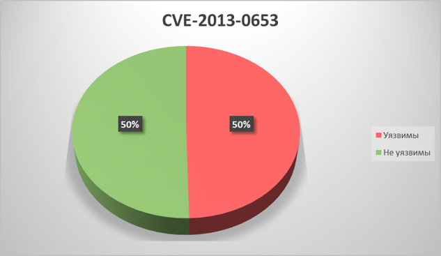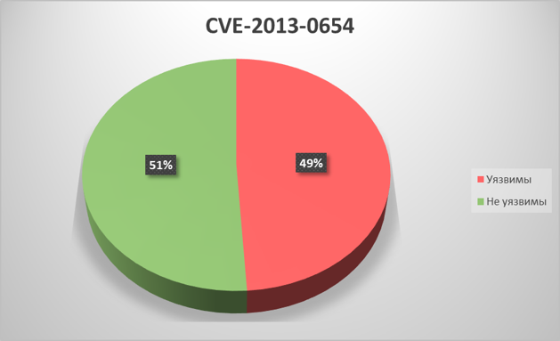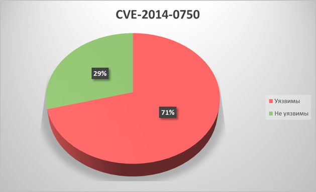 По каждой из уязвимостей мы посчитали соотношение уязвимых и неуязвимых систем на промышленных компьютерах пользователей «Лаборатории Касперского». Результаты приведены ниже. Ещё раз отметим, что эти данные отражают ситуацию на машинах только клиентов нашей компании, и только тех, кто принимает добровольное участие в программе KSN, и могут не совпадать с распределением уязвимых и неуязвимых систем на промышленных компьютерах всех клиентов General Electric.