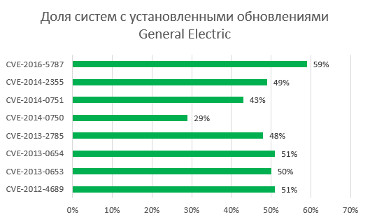 Практически для всех исследованных уязвимостей в продуктах General Electric доля систем с установленными обновлениями попадает в диапазон от 40 до 60 %. Исключение — уязвимость CVE-2014-0750, у которой этот показатель составляет всего 29%. Такой небольшой процент может быть обусловлен тем, что General Electric не выпустила патча для этой уязвимости, была только инструкция для исправления уязвимости «вручную».