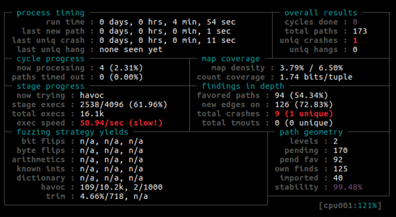 Однако, при всех наших усилиях, нам удалось добиться скорости фаззинга всего в 5 exec/s. Это настолько медленная скорость, что для того, чтобы найти уязвимость даже таким умным фаззером, как AFL, потребовалось бы слишком много времени.