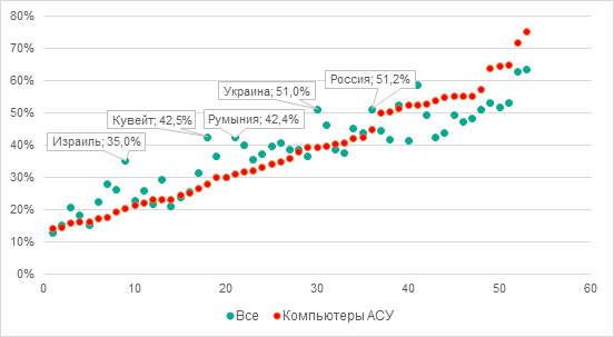 Данные получены с защищаемых продуктами «Лаборатории Касперского» компьютеров АСУ, которые Kaspersky Lab ICS CERT относит к технологической инфраструктуре организаций. В эту группу входят компьютеры, работающие на операционных системах Windows и выполняющие одну или несколько функций: