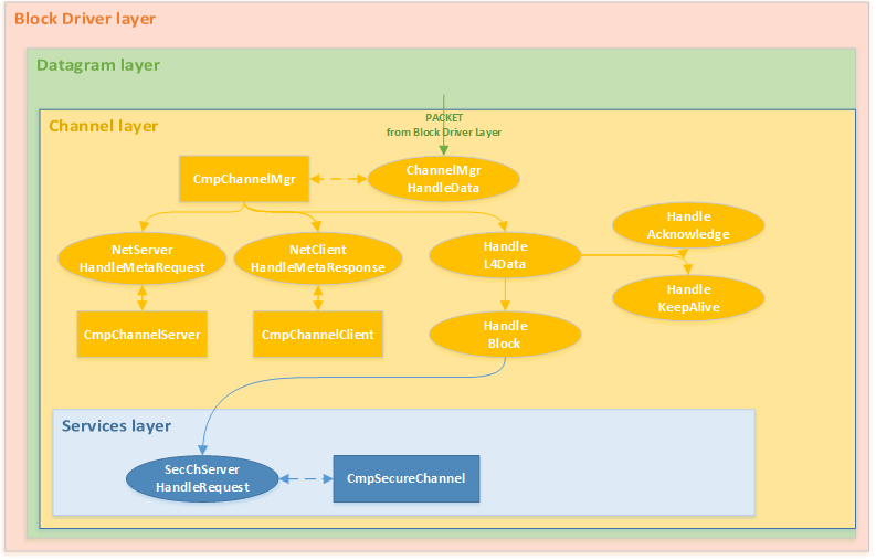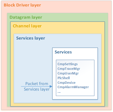 Основная задача компонентов из группы Block Drivers — создание возможности коммуникации через физический или программный интерфейс. Любой компонент Block Drivers является «входной точкой» для получения информационного пакета и точкой его отправки. Поэтому эти компоненты перед отправкой пакета могут добавить дополнительные поля в протоколе.