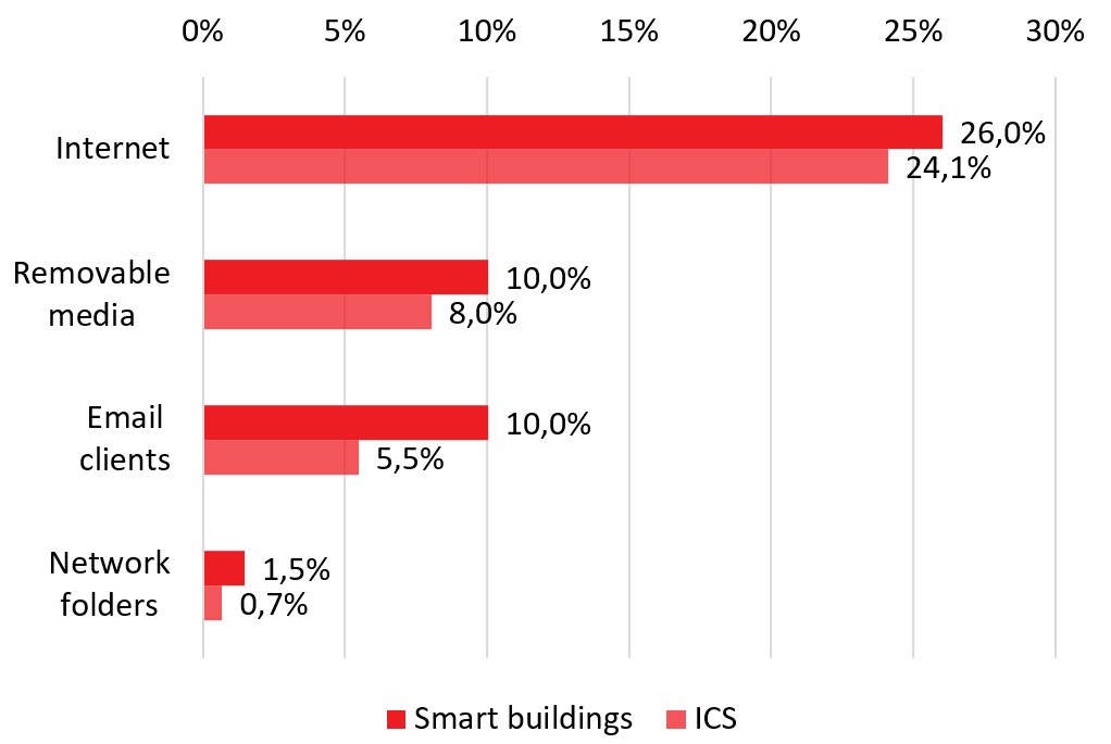 В процессе изучения источников угроз для систем автоматизации зданий мы решили сравнить их с аналогичной статистикой по промышленным системам, которую мы регулярно собираем и публикуем. Вот что у нас получилось: