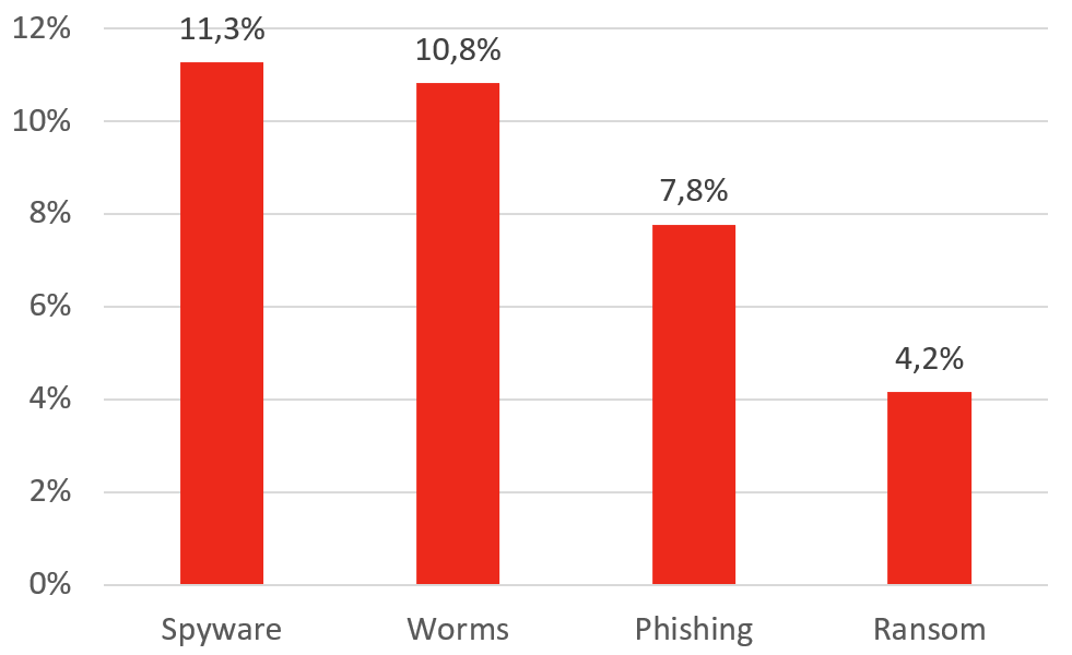 На графике видно, что у систем автоматизации зданий доля атакованных компьютеров стабильно выше по сравнению с промышленными системами. При этом общая доля атакованных компьютеров за тот же период времени больше у промышленных систем (41,2%). Это связано с тем, что системы автоматизации зданий больше похожи на системы в IT-сегменте: с одной стороны, они лучше защищены по сравнению с промышленными, поэтому общий % ниже; с другой стороны, они имеют большую поверхность атаки (т. е. у них в бОльшем количестве случаев есть доступ в интернет, они чаще используют корпоративную почту и съемные носители), поэтому на каждый компьютер приходится больше угроз из разных источников.