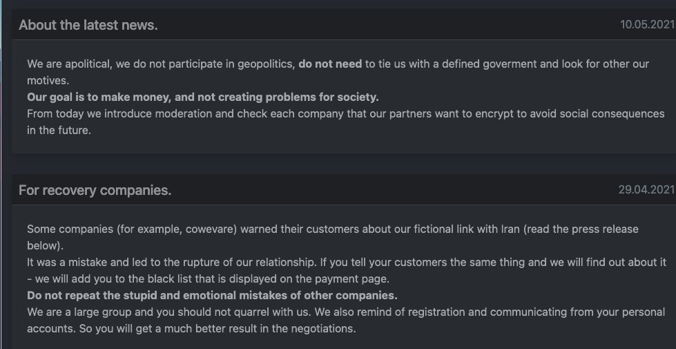 Хороший пример — русскоязычный форум XSS (ранее DaMaGeLab). Группы разработчиков рэнсомов (REvil, LockBit, DarkSide, Netwalker, Nefilim и так далее) часто использовали этот форум для рекламы и привлечения новых клиентов. 14 мая администрация форума запретила рекламировать и продавать на сайте любые программы-вымогатели. Как справедливо отмечено на сайте, «это слово “рэнсом” стало опасным и токсичным».