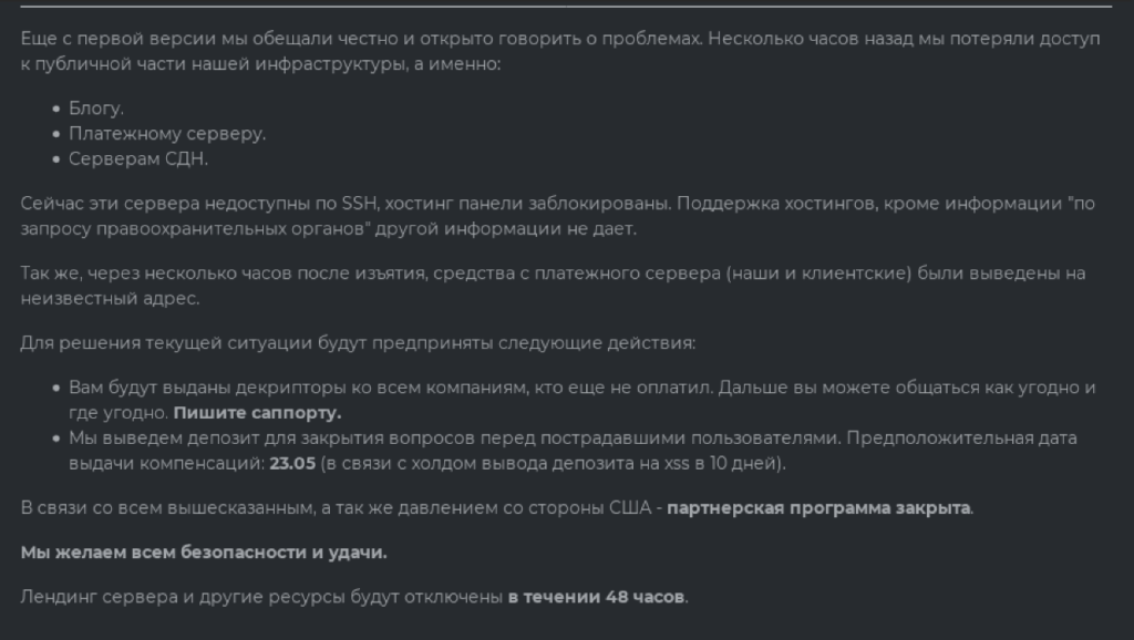 14 мая разработчики DarkSide сообщили, что потеряли доступ к части своей инфраструктуры, включая блог, платёжный сервер, CDN. Все средства, в том числе их собственные и «клиентские» (деньги партнёров, по всей видимости), были выведены на неизвестный им адрес. Они обещали до 23.05.2021 выплатить компенсации своим партнёрам из ранее размещённого депозита и передать утилиты расшифровки всем своим партнёрам через канал «технической поддержки». И объявили о полном закрытии сервиса и партнёрской программы.