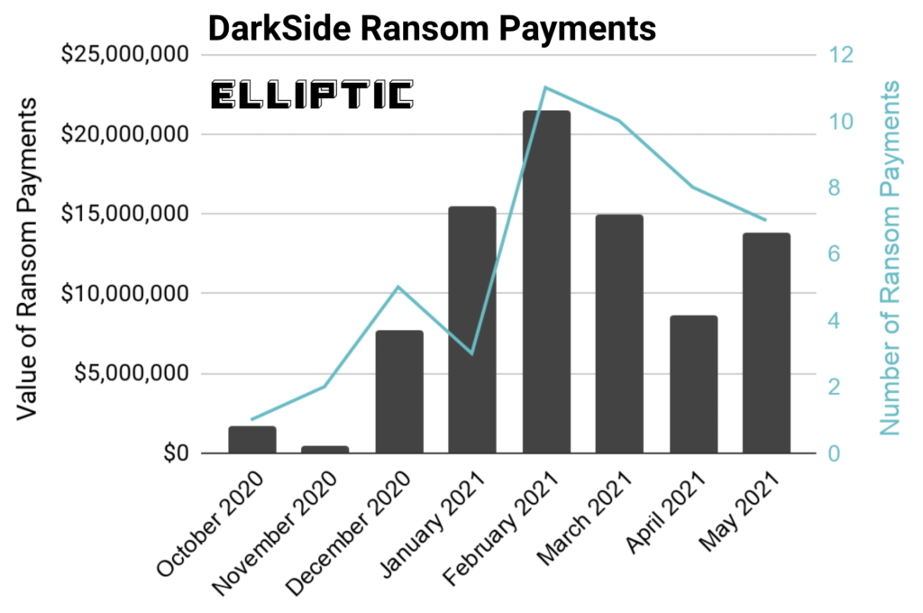 14 мая компания Elliptic cообщила, что (на основе сбора разведданных и анализа транзакций блокчейна) определила биткойн-кошелек, используемый группой DarkSide для получения выкупа от своих жертв. И на этот кошелек 8 мая пришел 75 BTC платеж от Colonial Pipeline. 9 мая большая часть полученной суммы была выведена из этого кошелька.